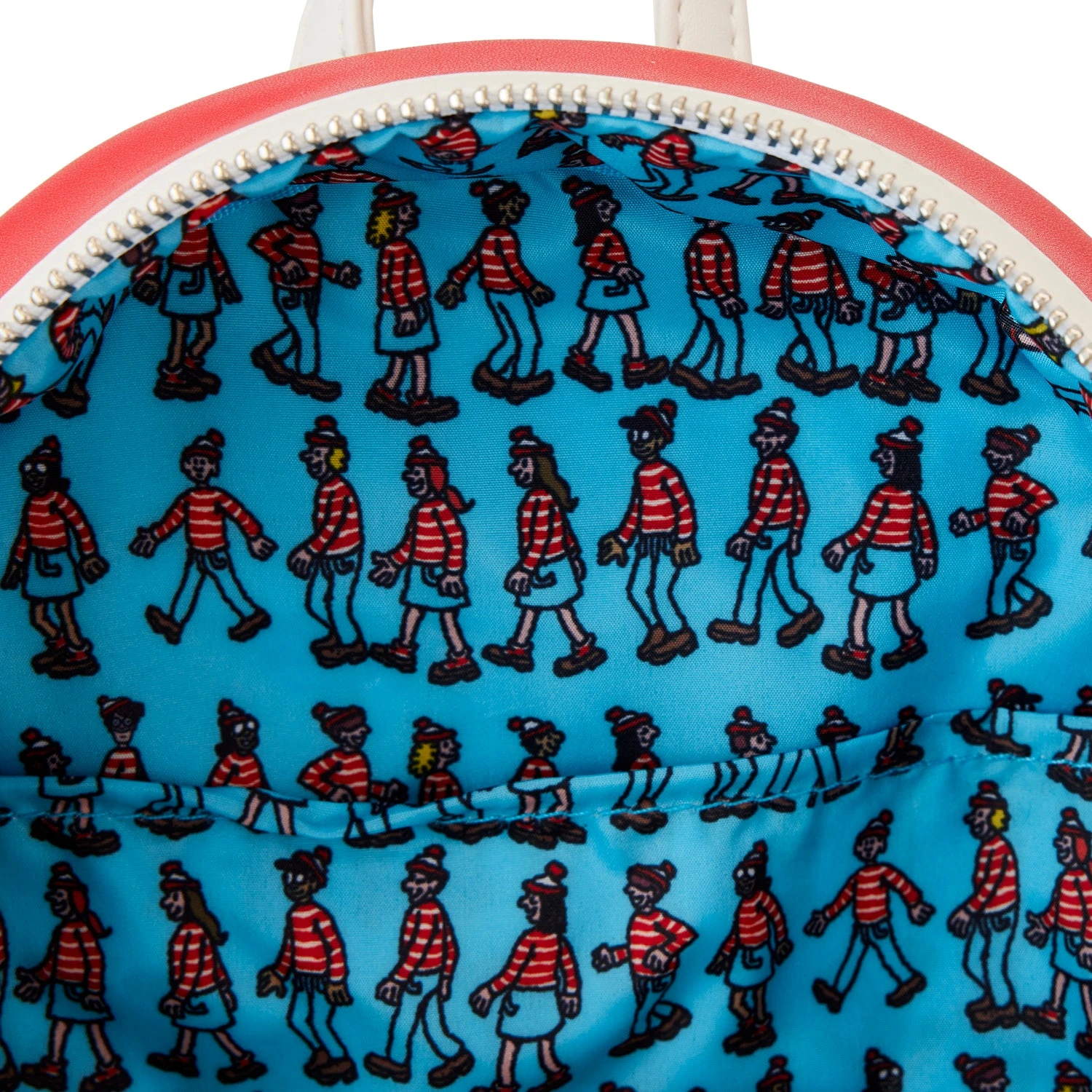 The Loungefly Where’s Waldo Cosplay Mini Backpack is made of vegan leather (polyurethane). Bag has adjustable shoulder straps and shiny silver hardware. Additional features include applique, PVC, embroidered, debossed, and printed details. Take note of the coordinating inside lining.