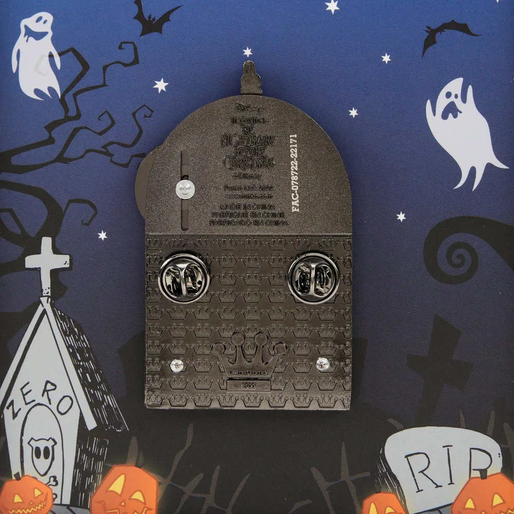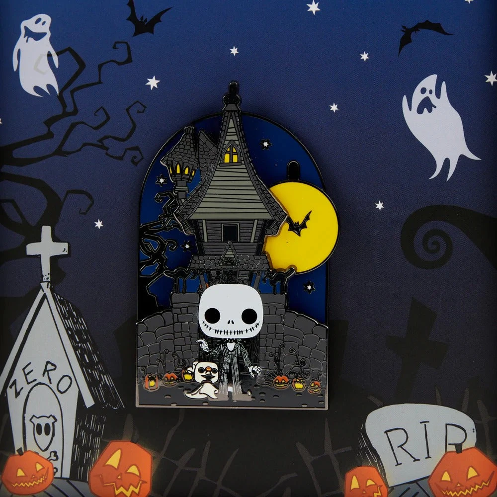 Prepare for a scare! The Funko Pop! Loungefly The Nightmare Before Christmas Jack Skellington House Sliding Pin brings some frightful fun to every day. On this layered 3-inch pin, Jack Skellington and Zero the ghost dog appear in Funko Pop! form outside the gates of Jack’s house. Near the tower, a flying bat slides up and down against the backdrop of the moon. This eerie enamel pin will help you embrace your spooky side while bringing thrills and chills to any outfit and is the perfect accessory for Disney fans who are looking to keep one of their favorite animated movies close.