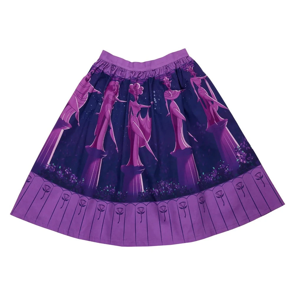 Be the hero you seek by wearing the Stitch Shoppe by Loungefly Hercules Muses Sandy Skirt. Against a backdrop of a glimmering night sky, the Muses stand holding up the temple structure which is inspired by classical Greek Ionic columns and architecture. The stars have aligned to reveal the lovely lilac, lavender, and royal purple design which is sure to help you decide your own wardrobe destiny.